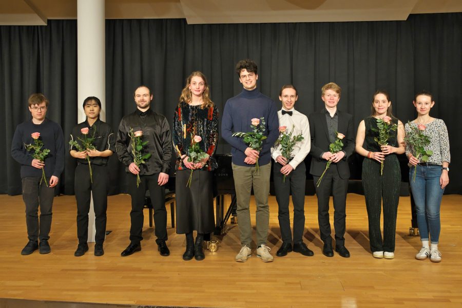 Finalist:innen (Foto v.l.n.r.): Artem Rychagov (Violine, Hochschule für Musik Detmold), Ying Hua (Percussion, HfM Detmold), Mikhail Aharodnikau (Kontrabass, HfM Detmold), Louisa Sieveke (Hochschule für Musik, Theater und Medien Hannover), Aaron Schröer (Cello, Norges Musikkhøgskole Oslo), Vincent Heeren (Klavier, Folkwang Universität der Künste, Essen), Mark Grishin (Bariton, HfM Detmold), Theresia Volbers (Universität Mozarteum Salzburg), Antonia Mütze (HfM Detmold).